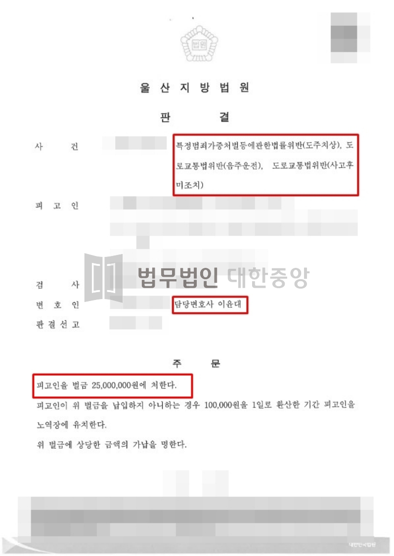 울산음주운전변호사 조력 사례 : 음주운전, 뺑소니(도주치상, 사고후미조치) 벌금형 성공